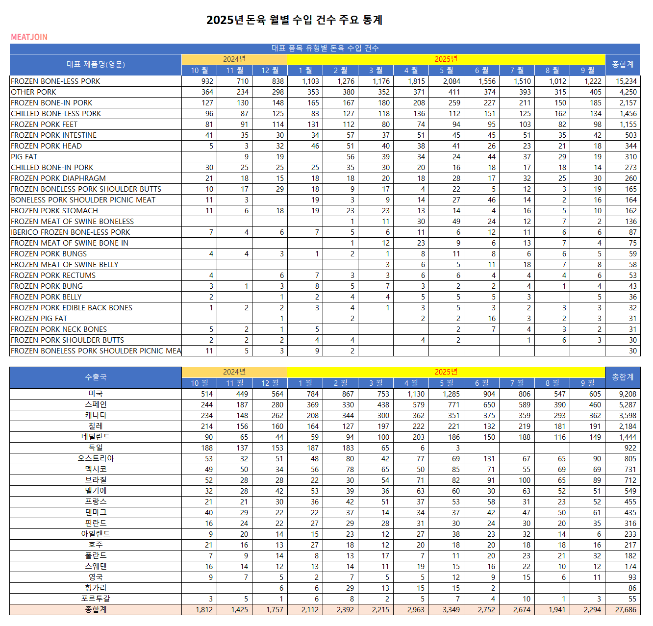 2025년 9월기준 돈육 월별 원산지/ 주요 제조업체별 통계