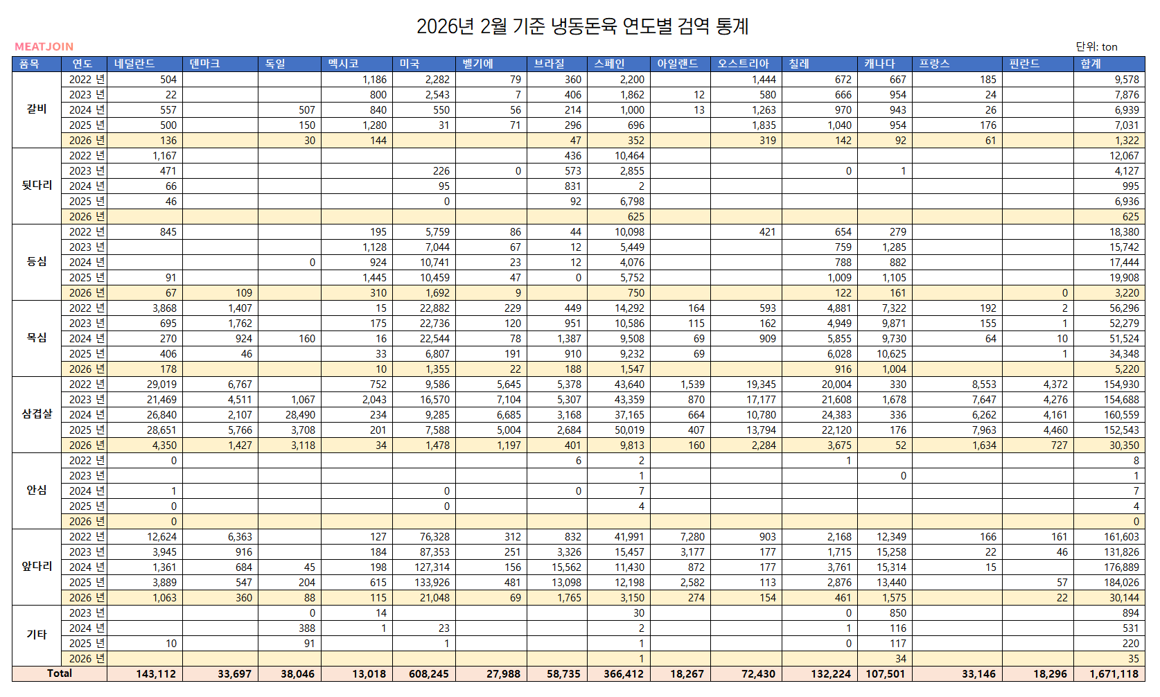 2026년 2월 냉동돈육 연도별 검역 통계