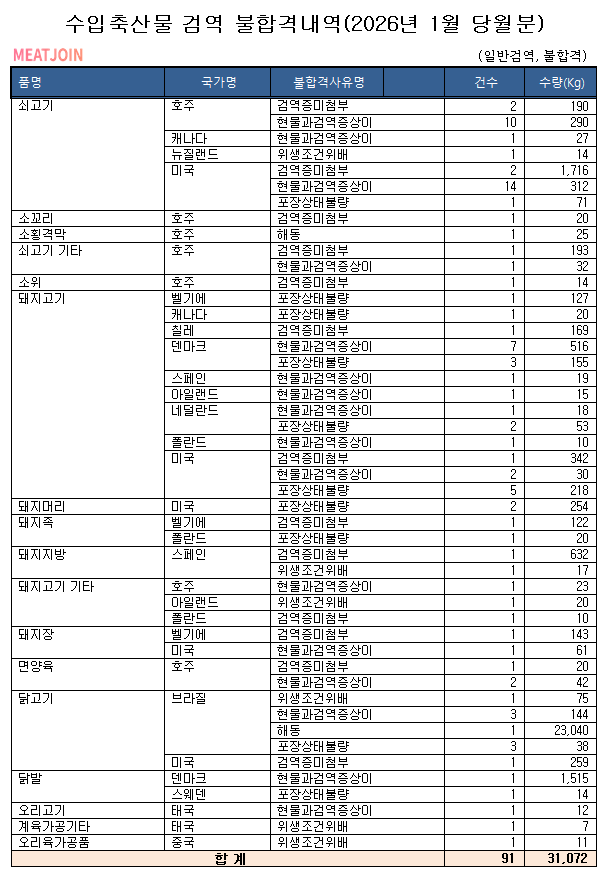 수입축산물 검역 불합격내역 (2026.1월분)