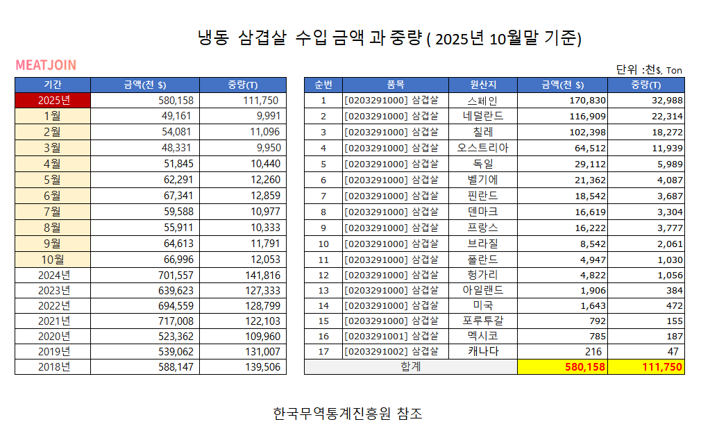 (2025년 10월말 기준) 냉동돈육 삼겹살 국가별 수입금액과 수입중량