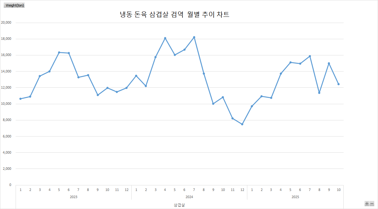 2025년 10월기준 냉동삼겹 검역량 기준 챠트