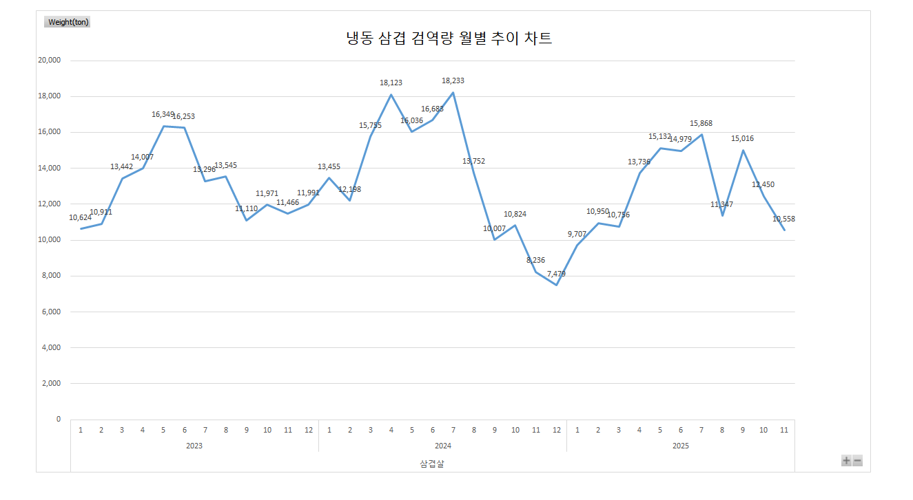 2025년 11월 기준 냉동삼겹 검역량 기준 차트