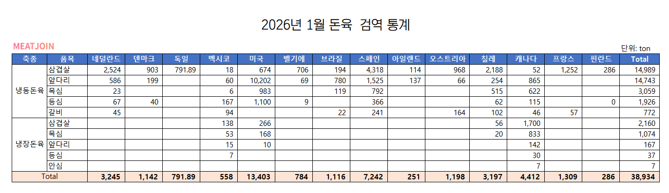 2026년 1월 냉동돈육 월별 검역 통계