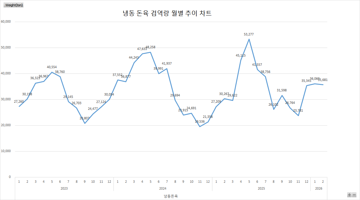 2026년 2월 기준 냉동돈육 검역량 기준 차트