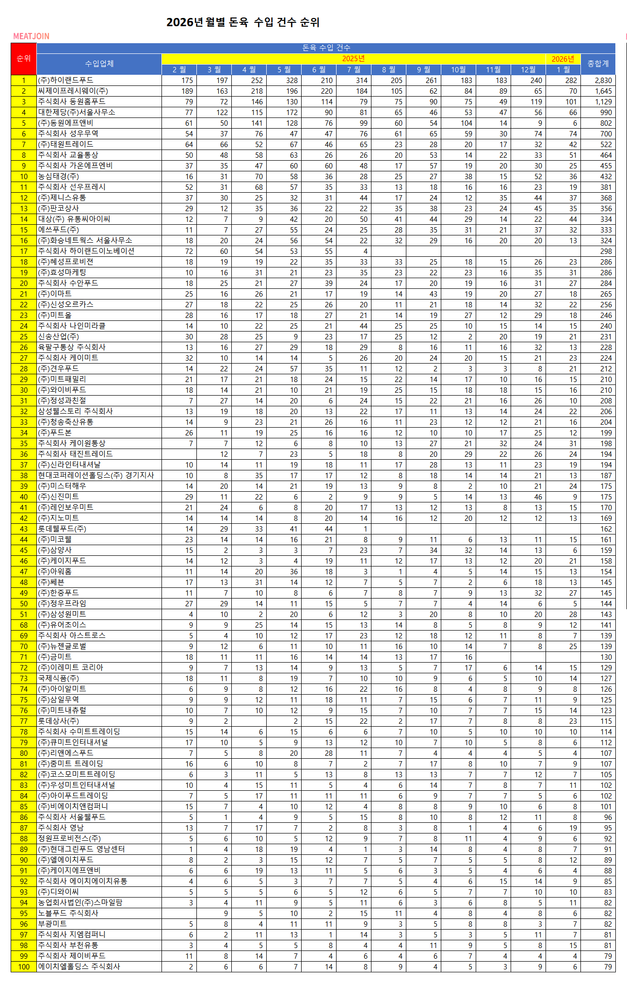 2026년 1월 기준 돈육 수입건수별 업체순위