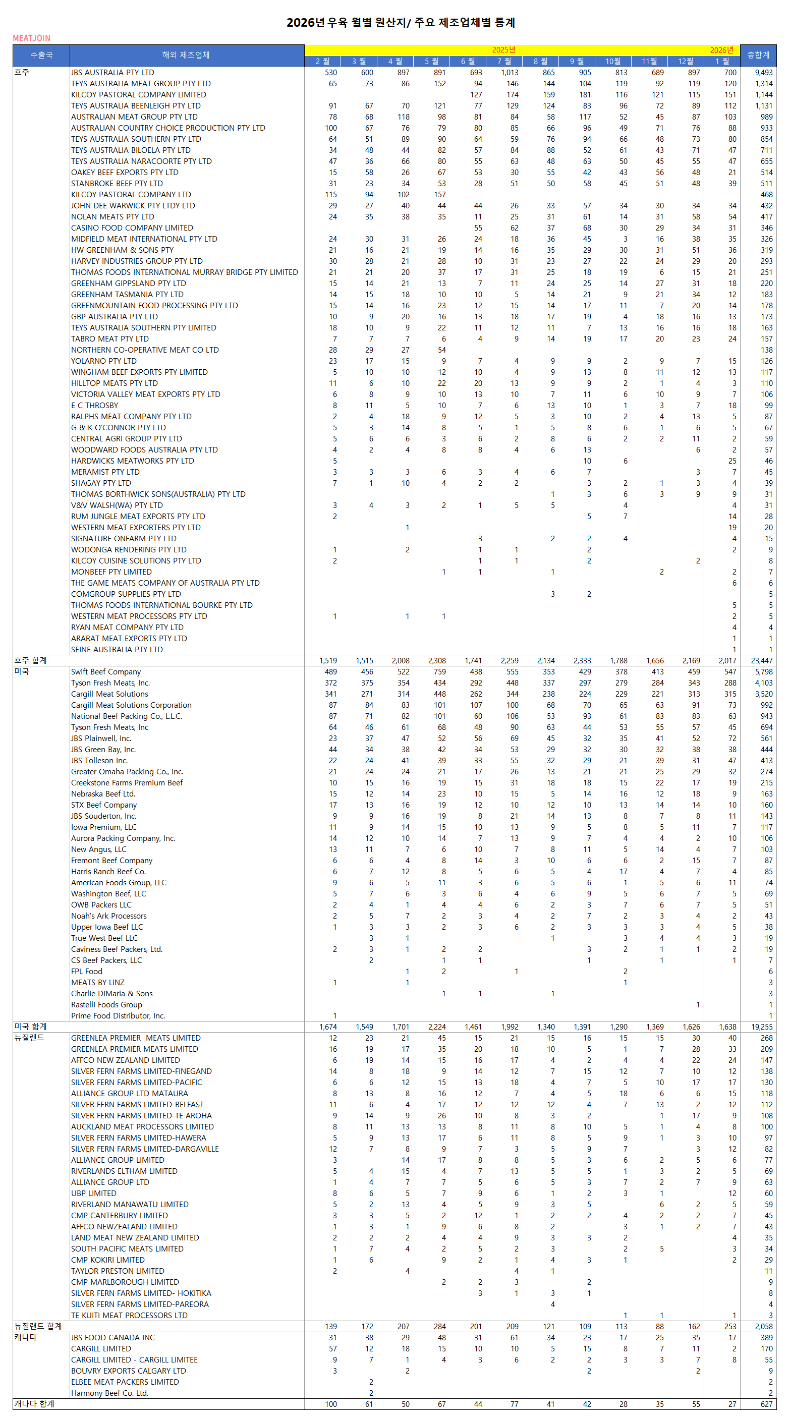 2026년 1월기준 우육 월별 원산지/ 주요 제조업체별 통계