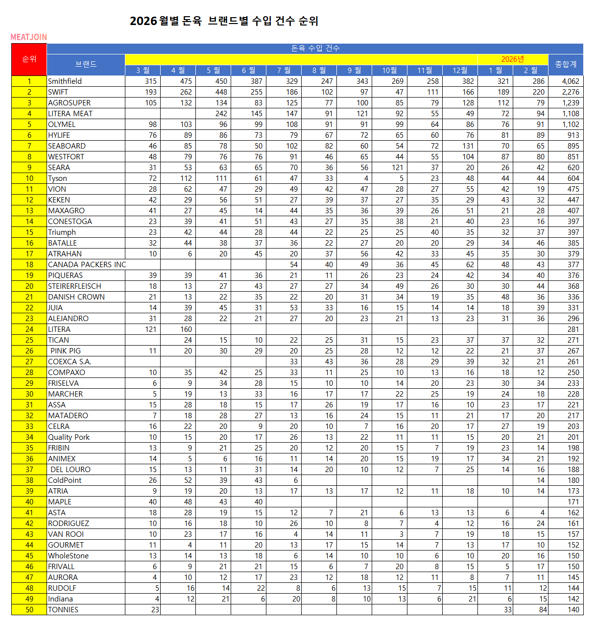 2026년 2월기준 월별 돈육 브랜드별 수입 건수 순위