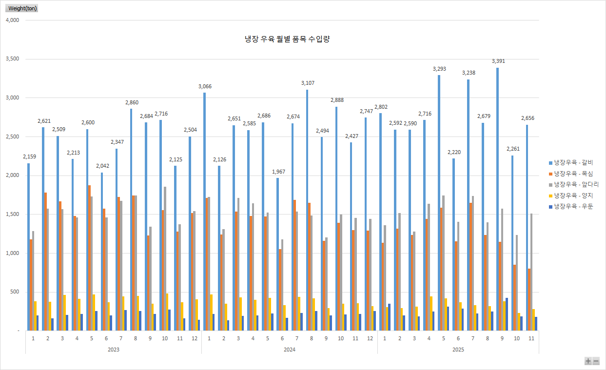 25년 11월 기준 냉동우육 주요품목 추이차트