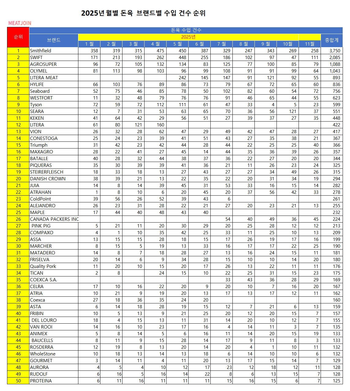 2025년 11월기준 월별 돈육 브랜드별 수입 건수 순위