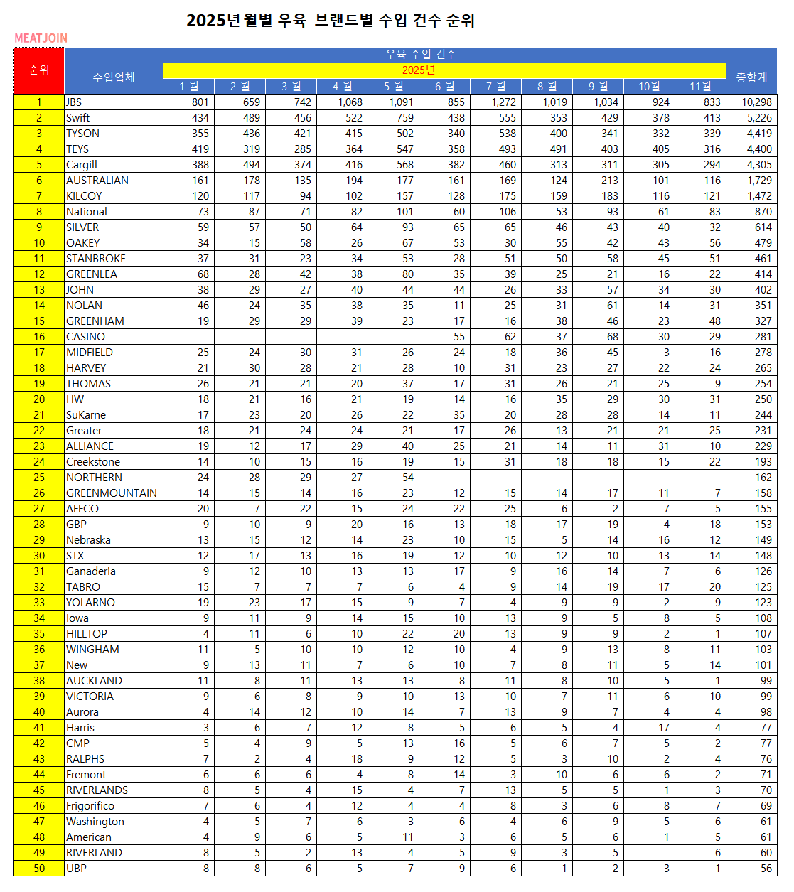 2025년 11월기준 월별 우육 브랜드별 수입 건수 순위