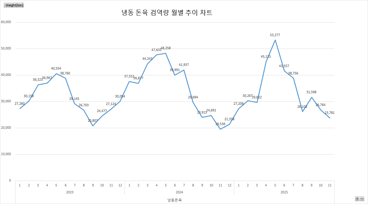 25년11월기준 냉동돈육 월별 추이 차트