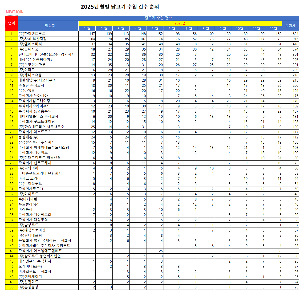 2025년 12월 기준 닭고기 수입건수별 업체순위