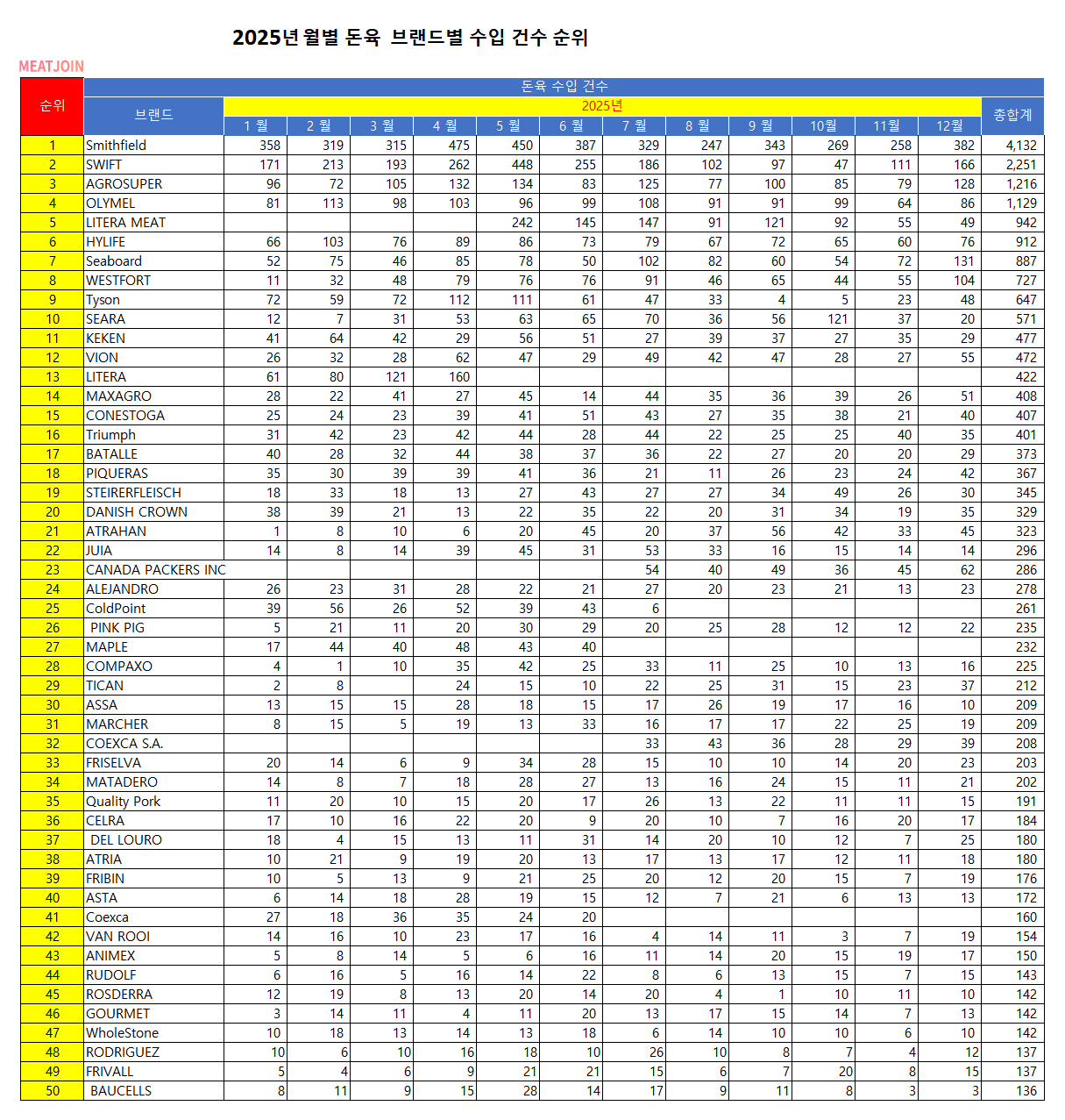 2025년 12월기준 월별 돈육 브랜드별 수입 건수 순위