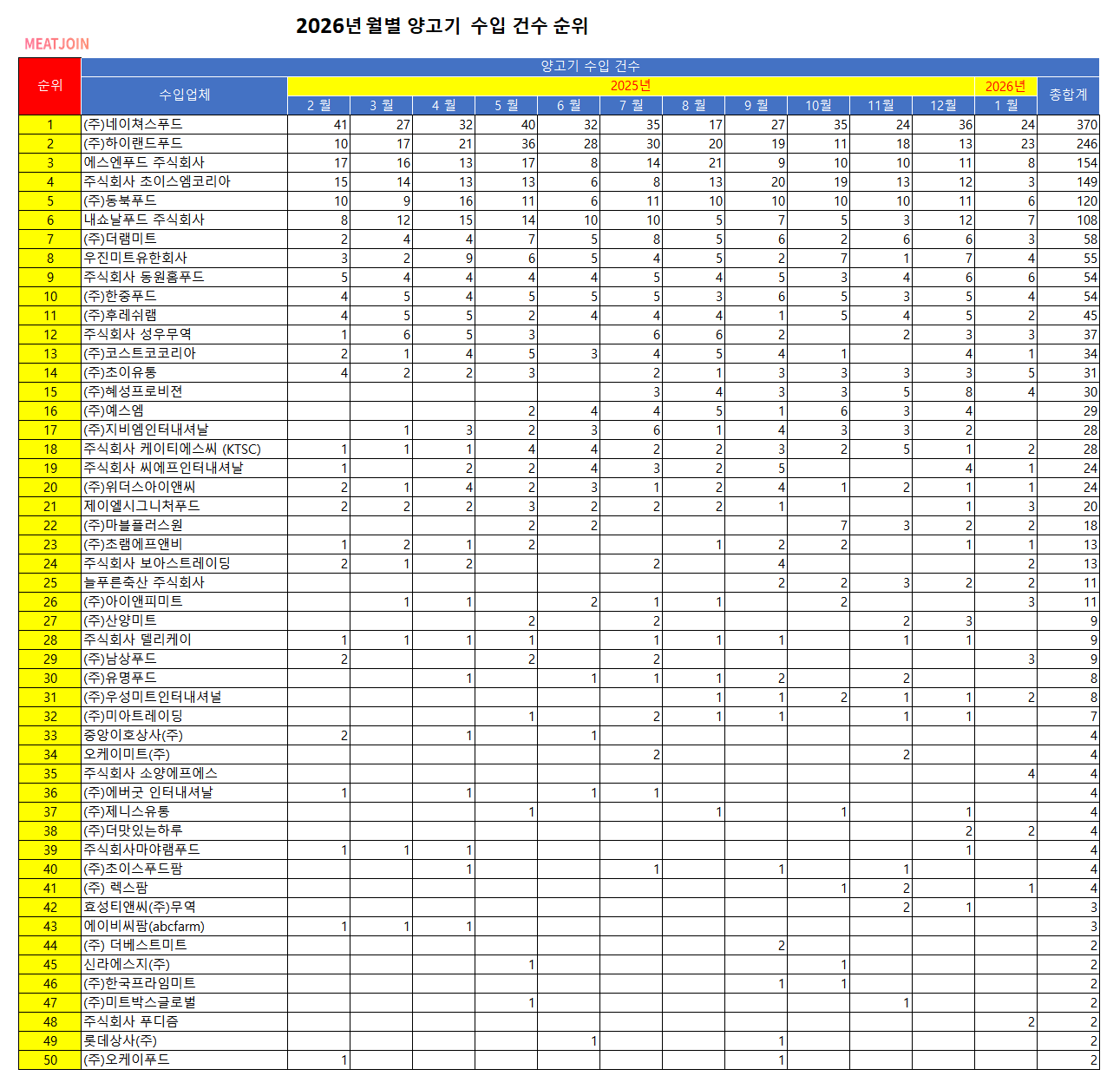 2026년 1월 기준 양고기 수입건수별 업체순위