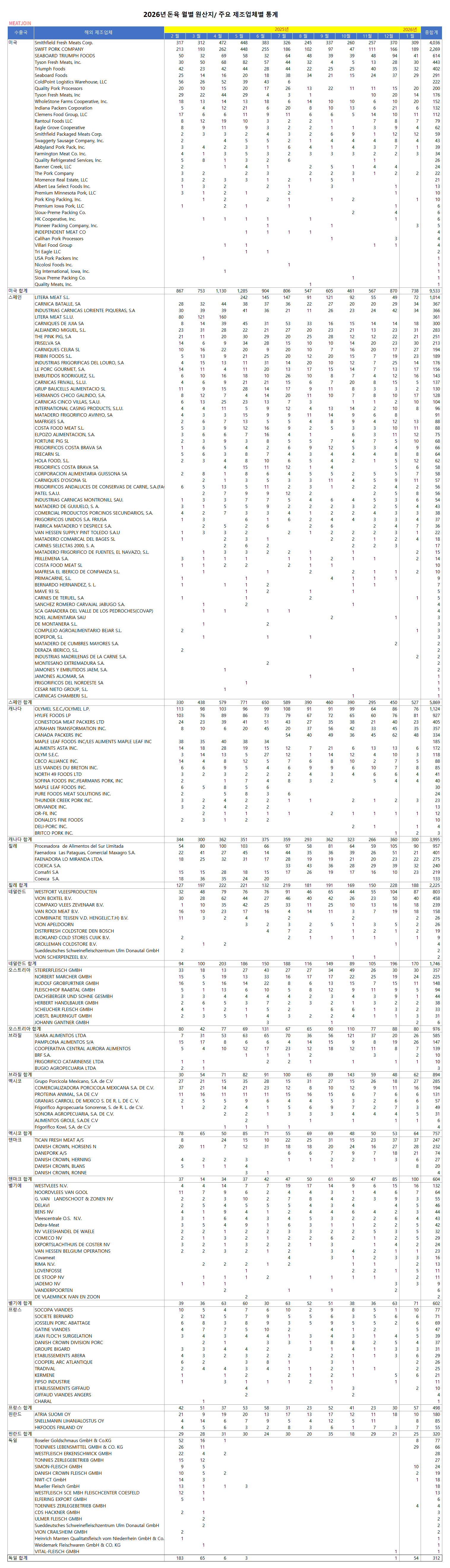 2026년 1월기준 돈육 월별 원산지/ 주요 제조업체별 통계