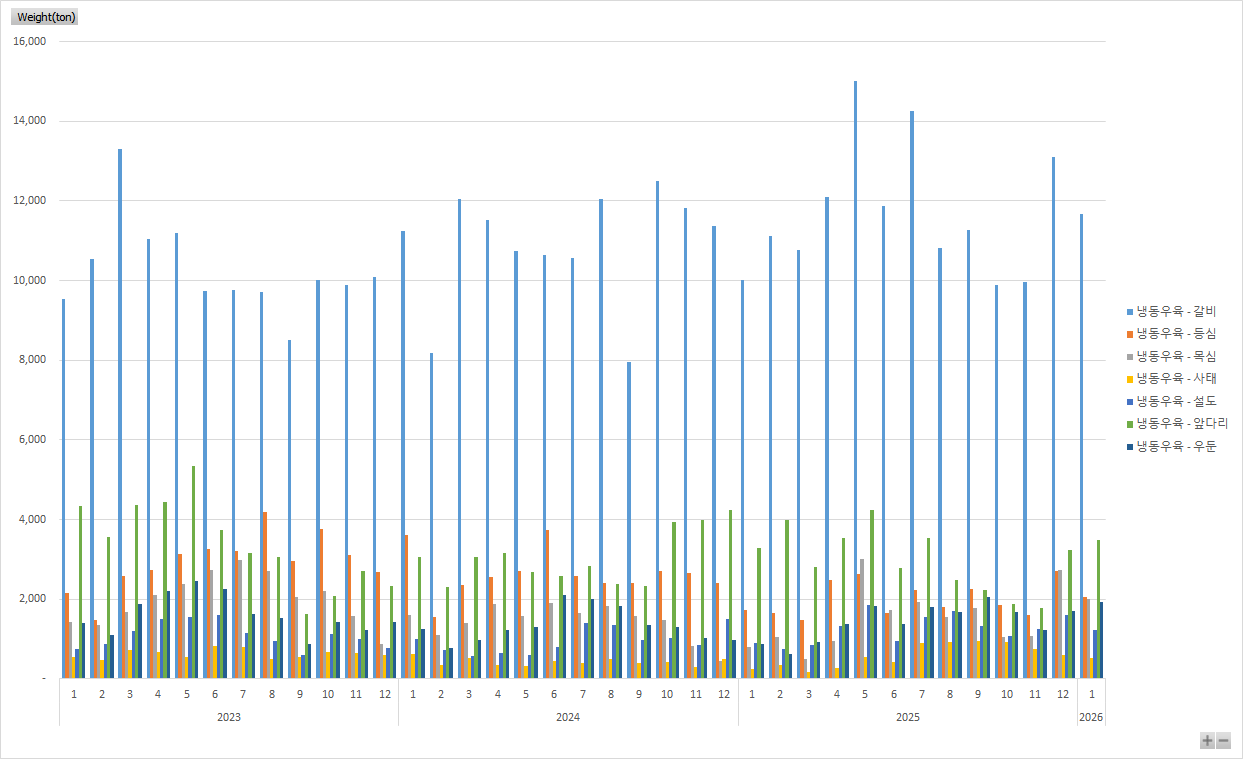 26년 1월 기준 냉동우육 주요품목 추이차트