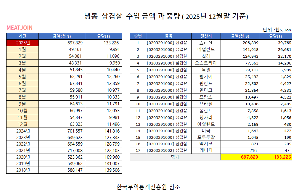 냉동돈육 삼겹살 국가별 수입금액 과 수입중량(25년12월 기준)
