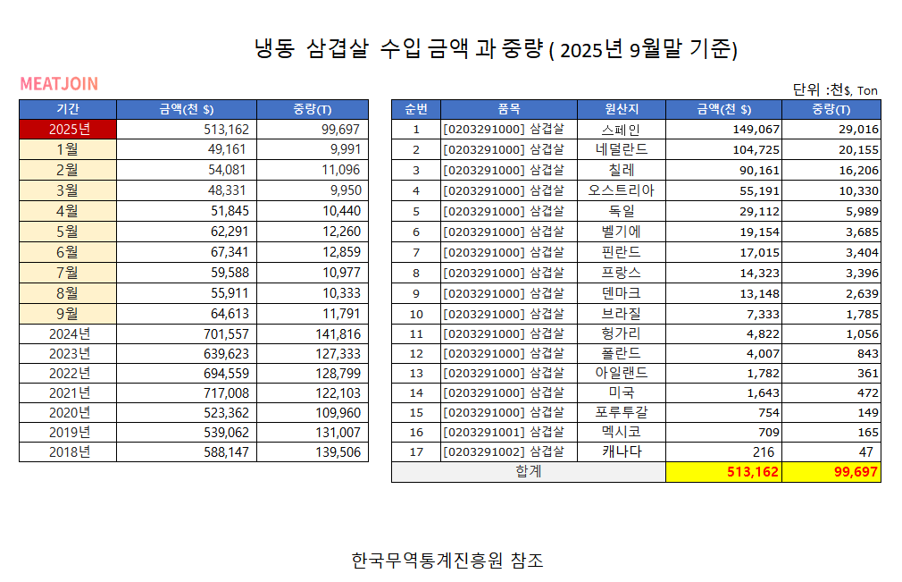 (2025년 9월말 기준) 냉동돈육 삼겹살 국가별 수입금액과 수입중량