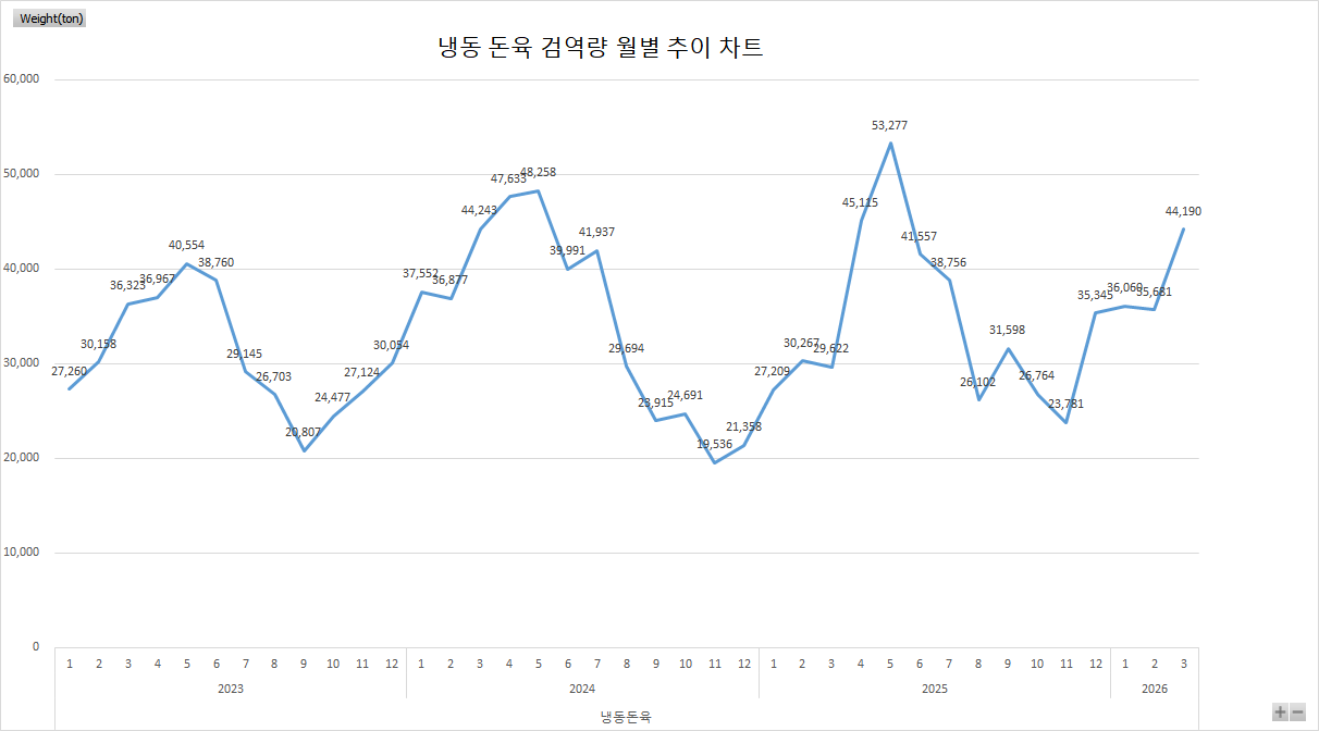 2026년 3월 기준 냉동돈육 검역량 기준 차트