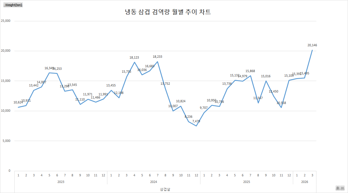 2026년 3월 기준 냉동삼겹 검역량 기준 차트