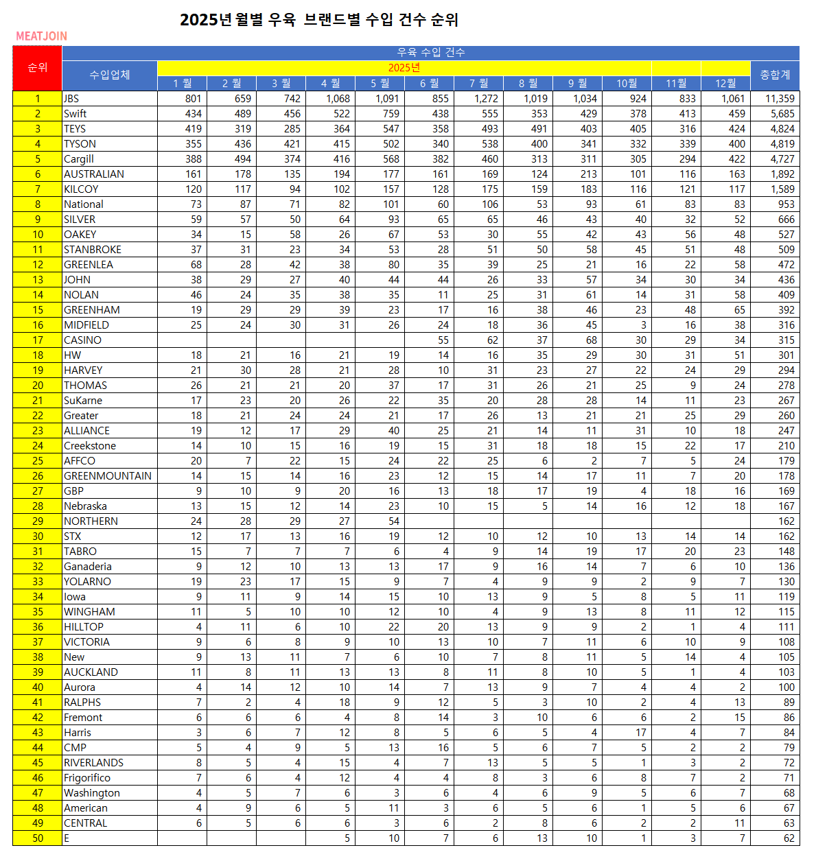 2025년 12월기준 월별 우육 브랜드별 수입 건수 순위
