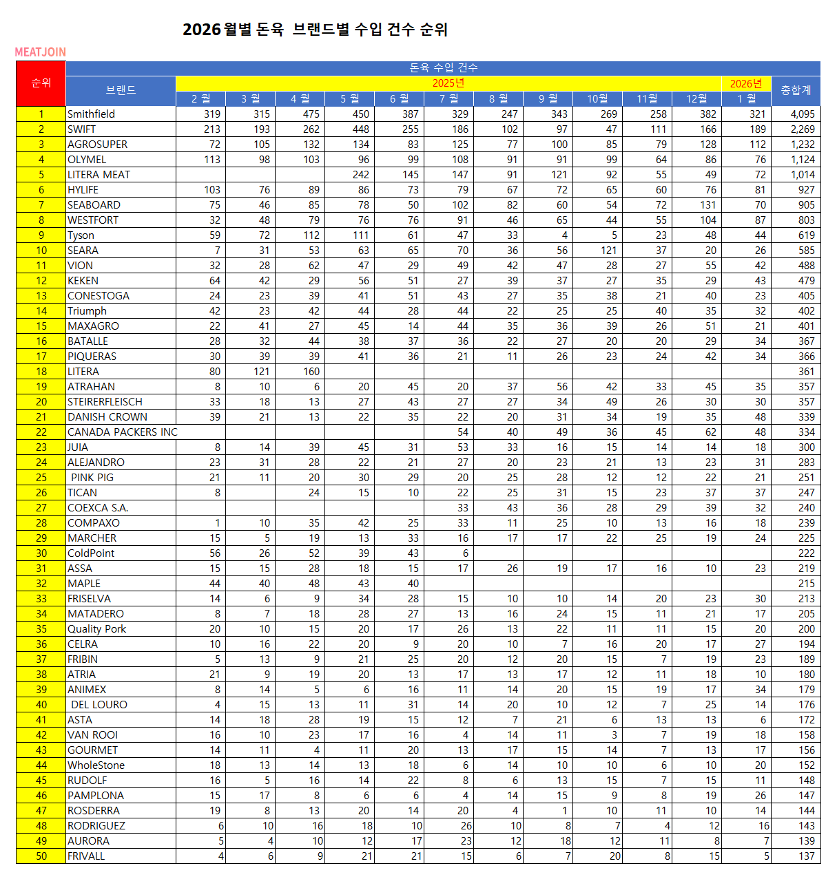 2026년 1월기준 월별 돈육 브랜드별 수입 건수 순위