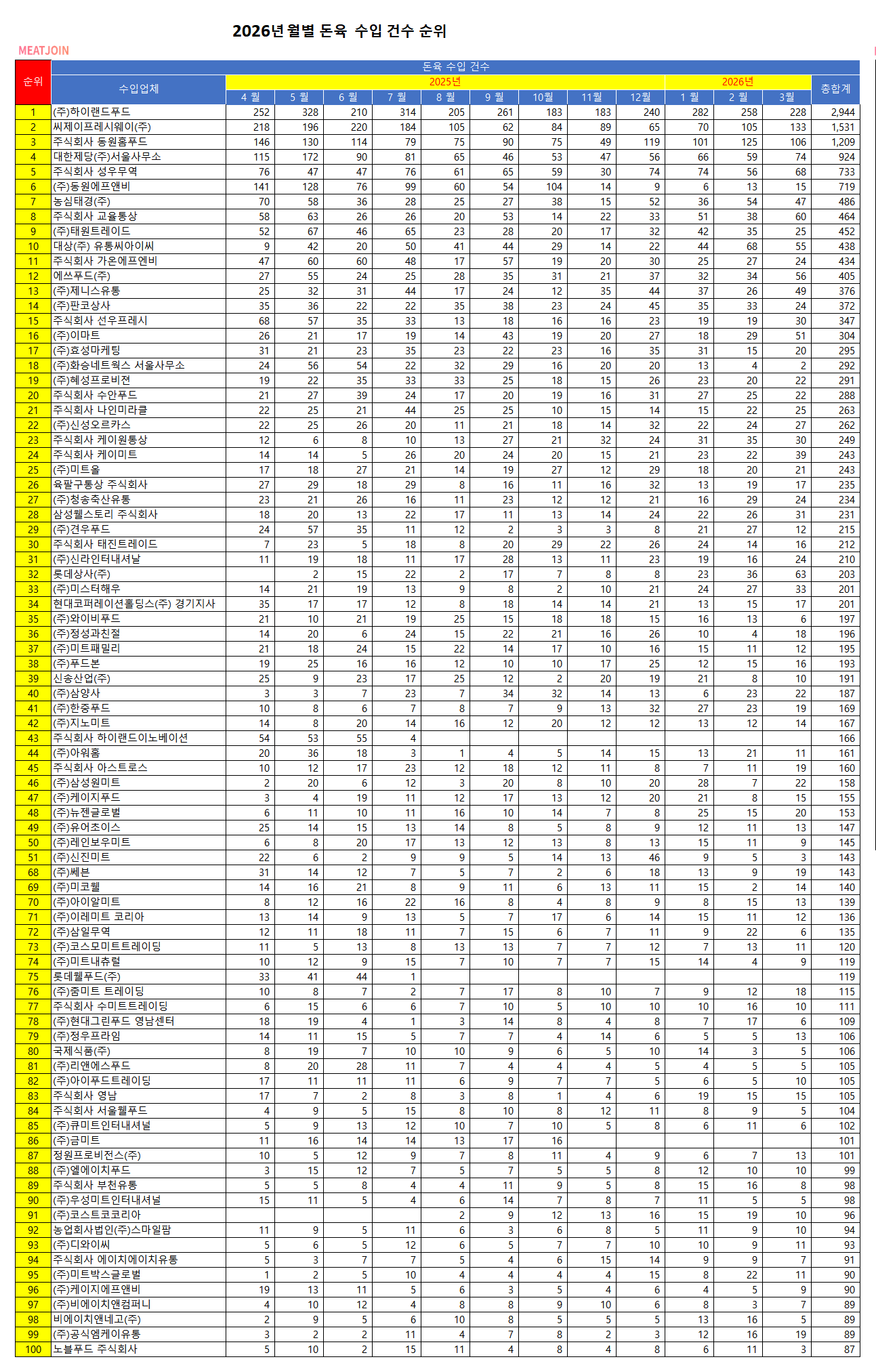 2026년 3월 기준 돈육 수입건수별 업체순위