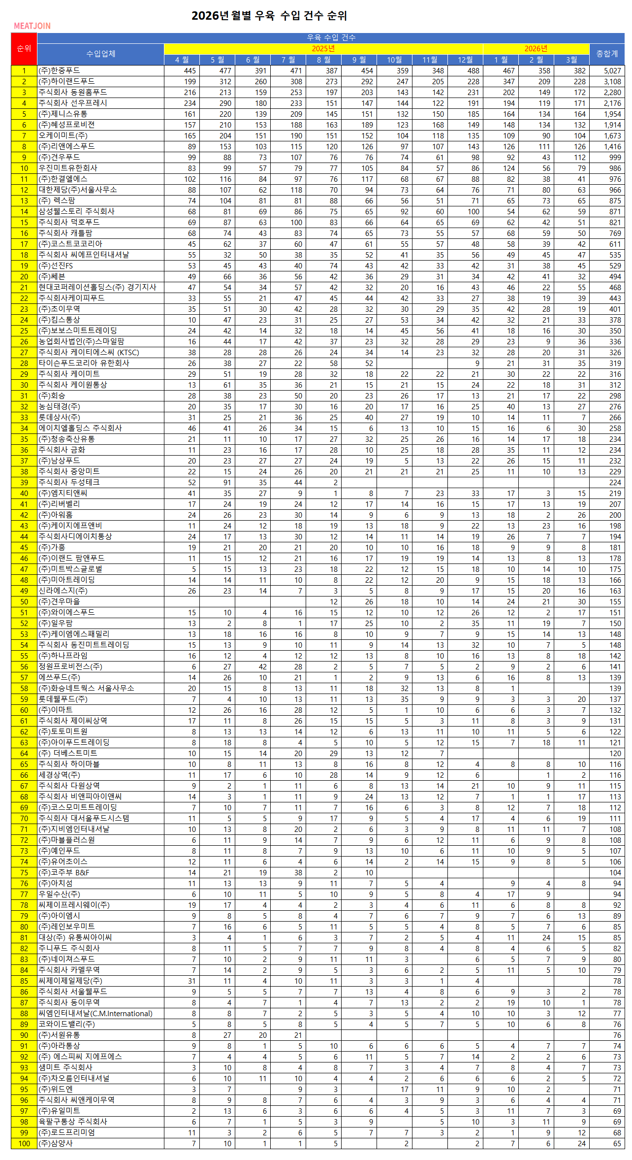 2026년 3월 기준 우육 수입건수별 업체순위