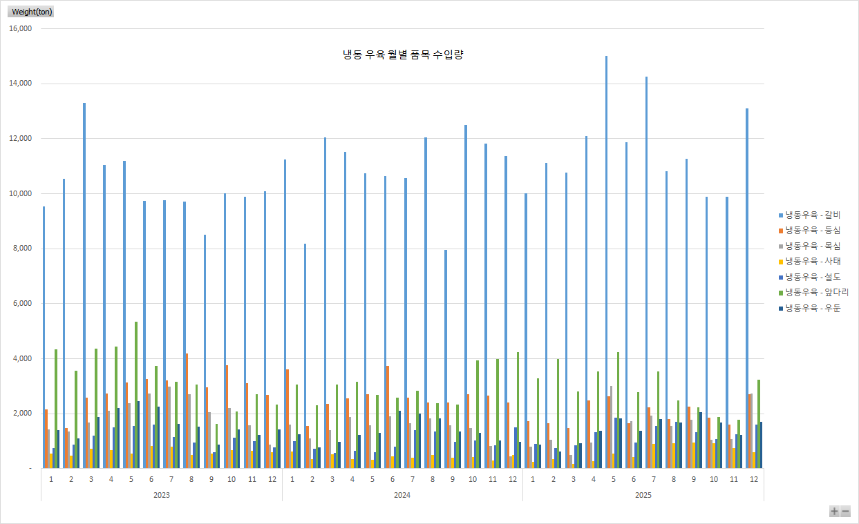 25년 12월 기준 냉동우육 주요품목 추이차트