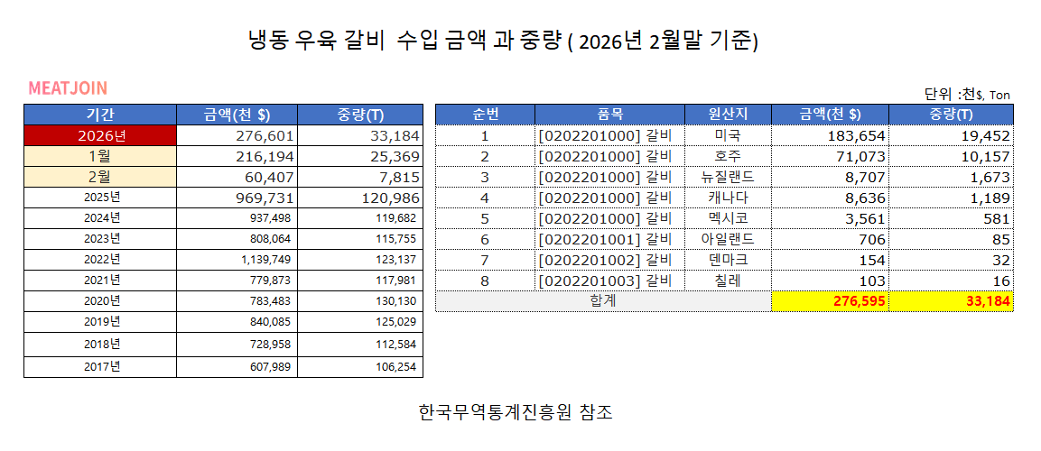냉동우육 갈비 국가별 수입금액 과 수입중량(26년2월 기준)
